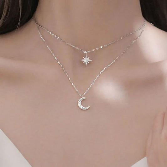 925 Sterling Sliver Full Zircon Star Moon Pendant Layered Necklace